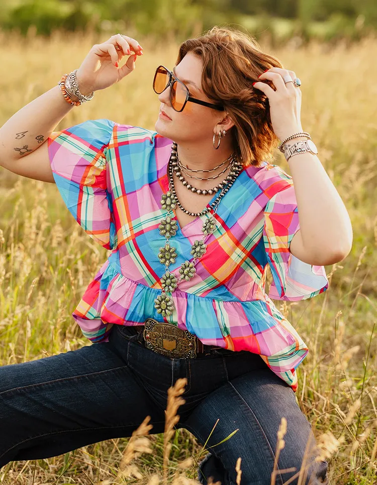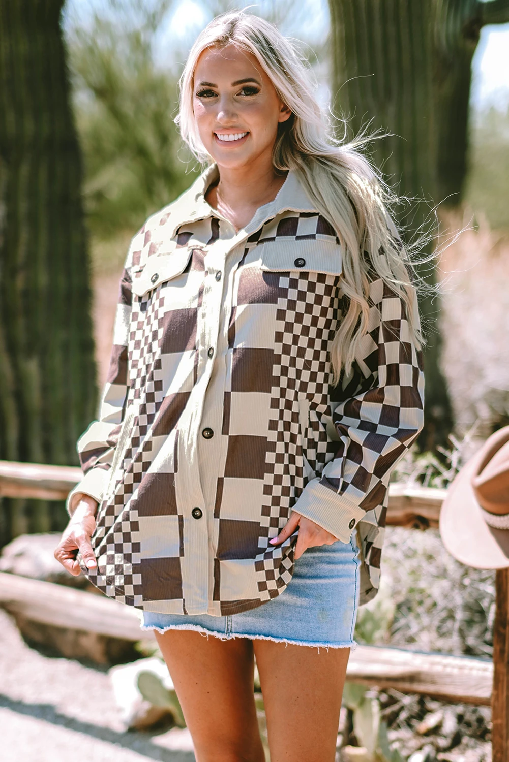 Khaki Checkerboard Striped Patchwork Lantern Sleeve Pocketed Blouse
