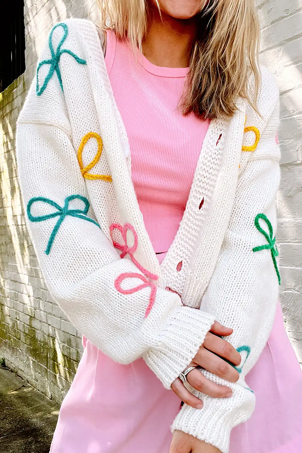 Light Pink Bow Thread Embroidery Ribbed Edge Sweatshirt