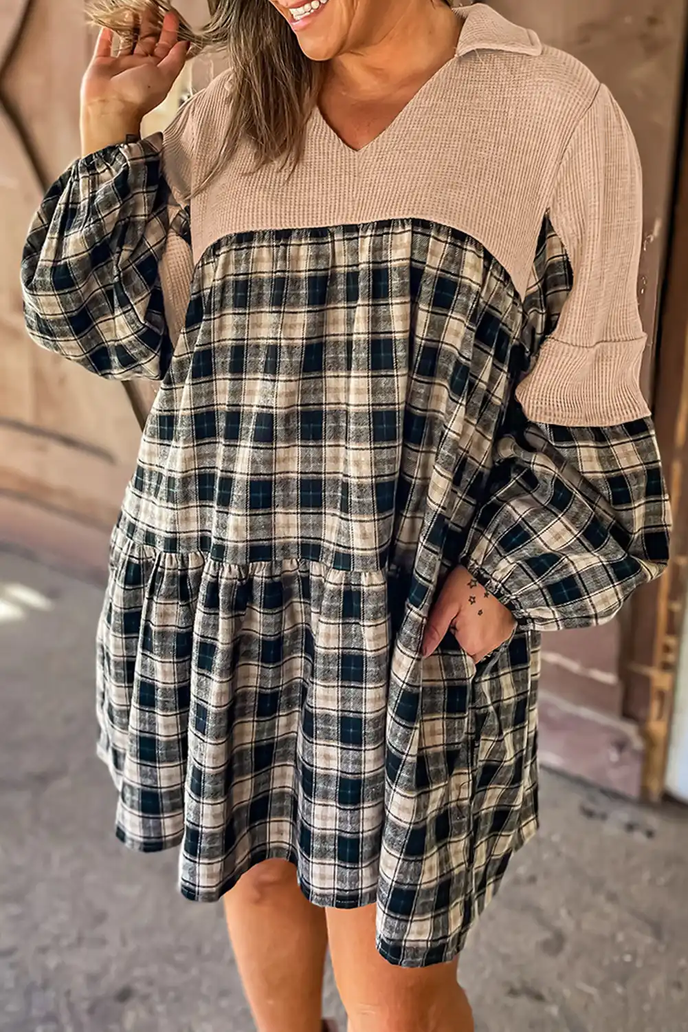 Khaki Checkerboard Striped Patchwork Lantern Sleeve Pocketed Blouse